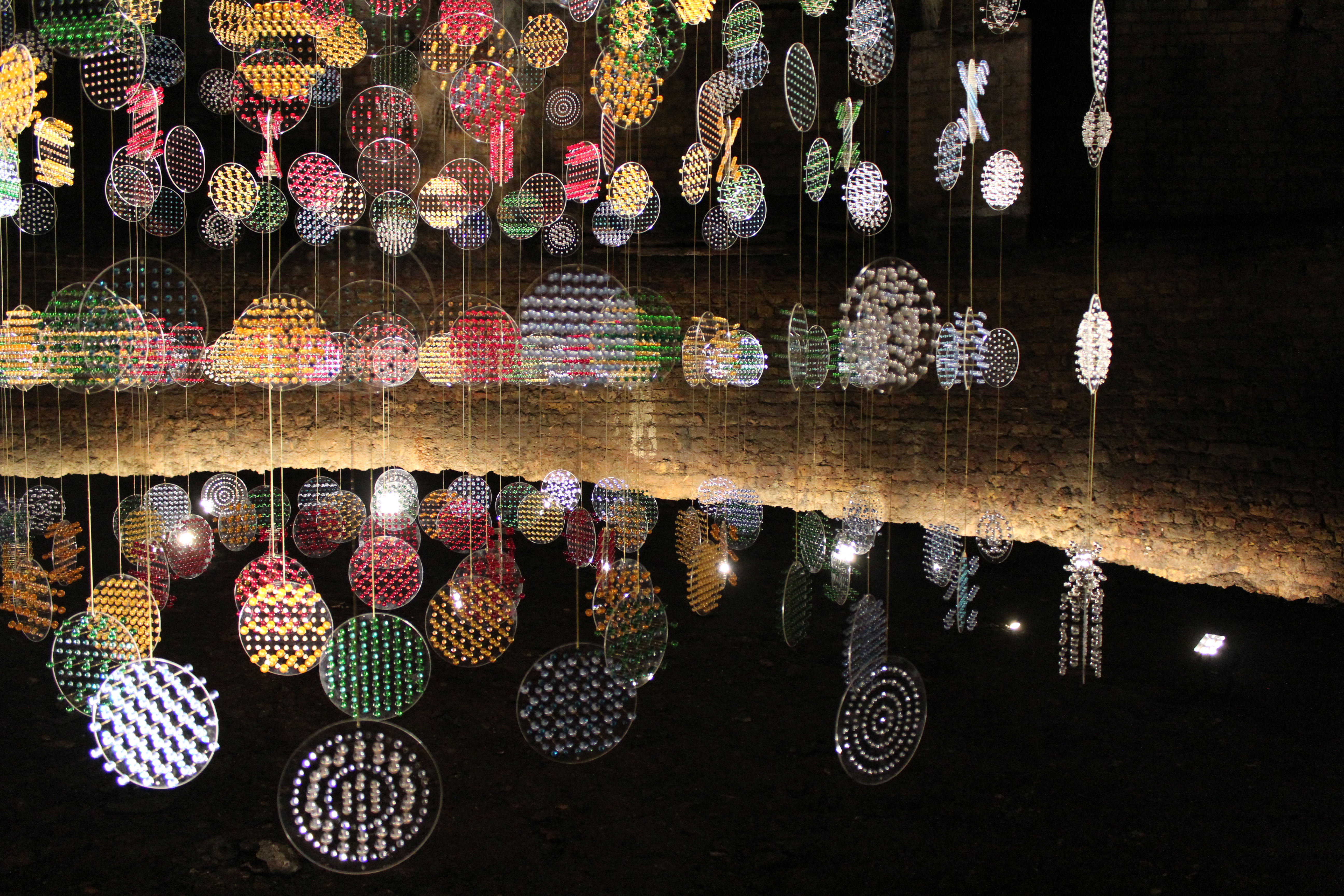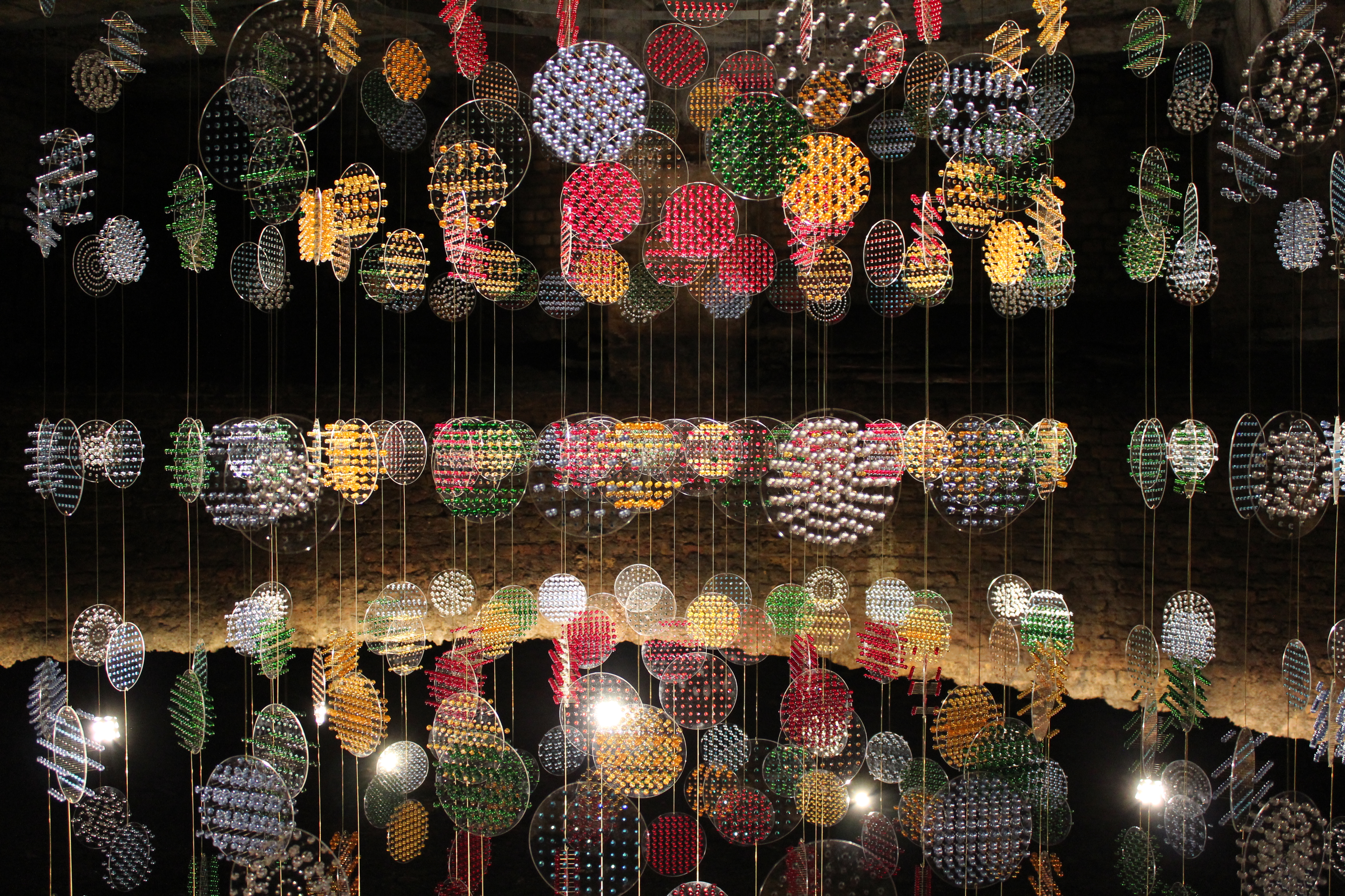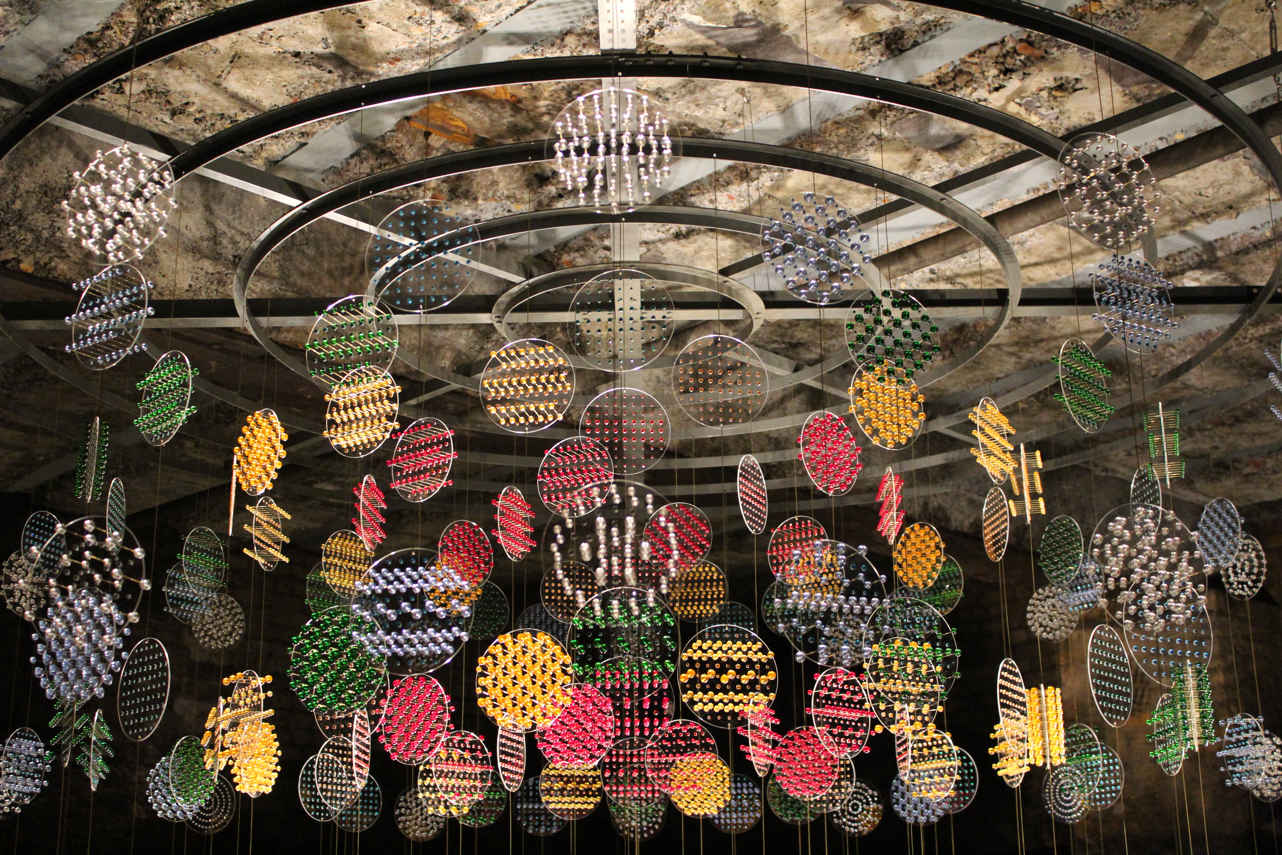 The work is created from everyday materials, including over one kilometre of brass rods (representing the history of science), and beads and diamantes (representing women’s contributions to physics). The space itself also informed the work’s design – and its dark, silent and rather cold environment is well-suited to it. This is one of those works that you really need to see for yourself, but suffice it to say that I could have spent another twenty minutes down there quite happily!