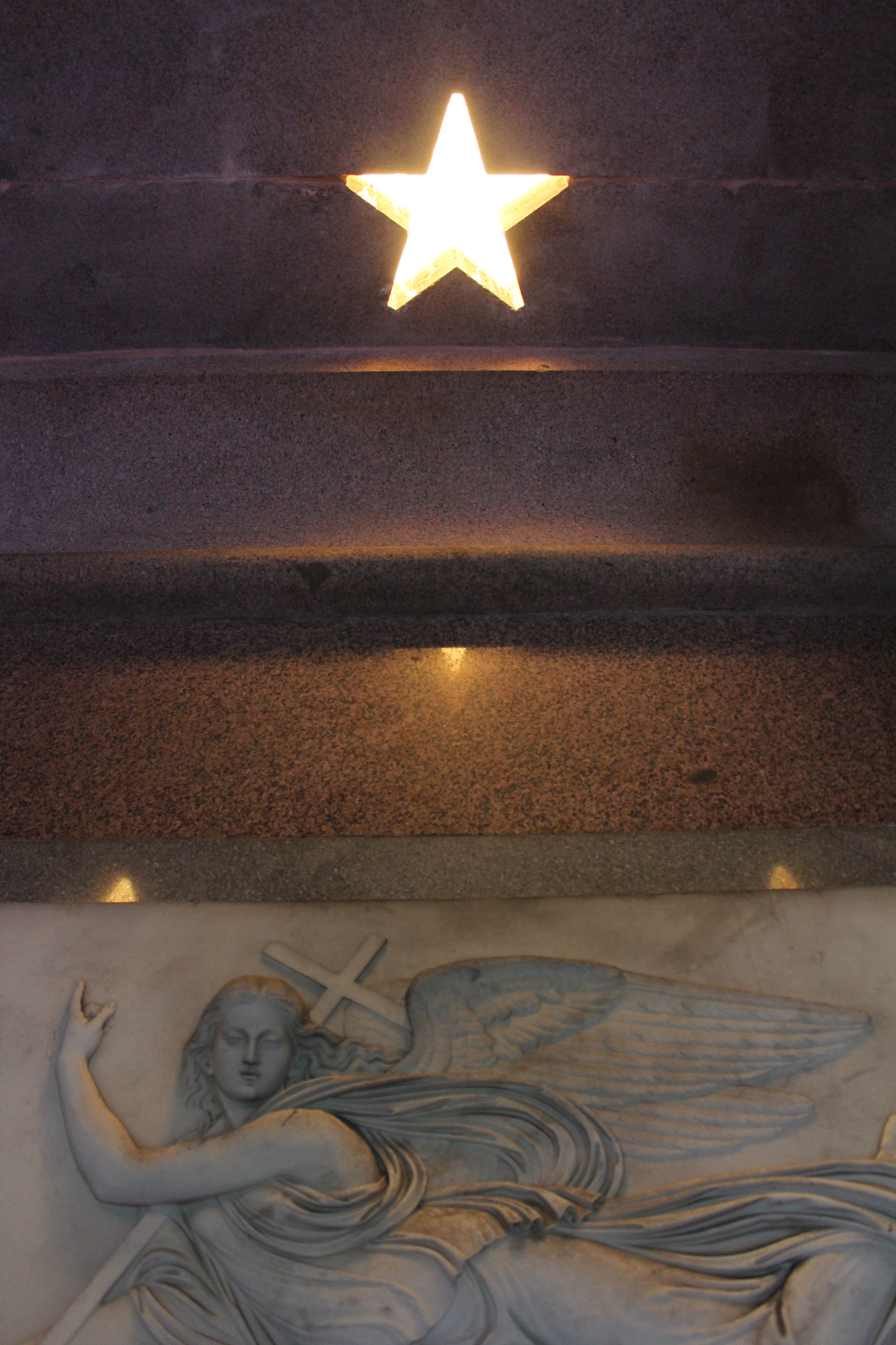 The mausoleum’s design is impressive – created by Henry Edward Kendall Jr in the Egyptian Revival style, it features cast bronze doors and pink Scottish granite. It is covered with Egyptian motifs, including the the winged sun disc of the god Ra. The skylight stars in the ceiling of the mausoleum allow the sun to project these stars across the coffins at certain times of the day. A large white marble relief carved by Lawrence MacDonald hangs on one wall, showing Priscilla on her death bed with the Earl at her feet and their son Charles at her side.