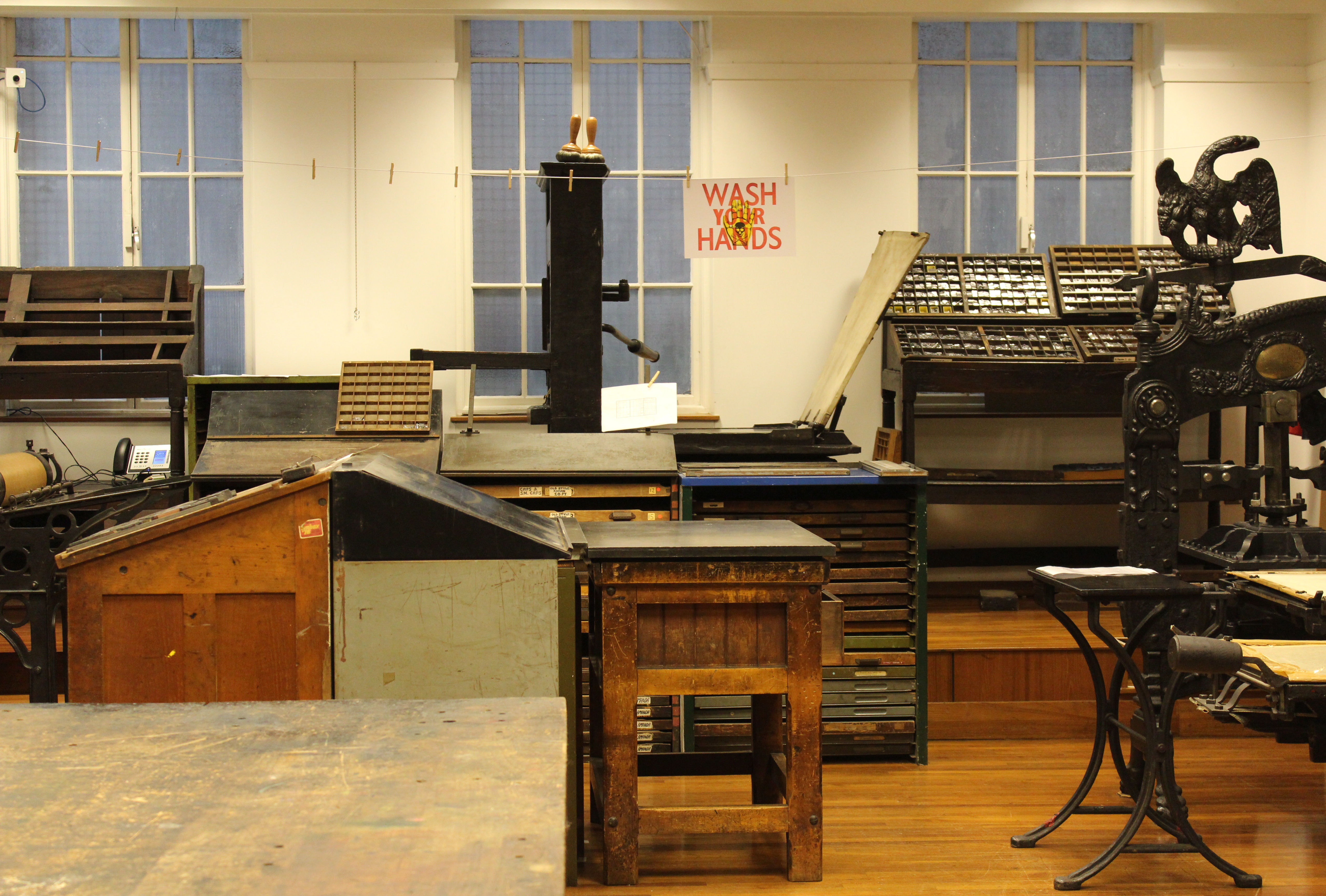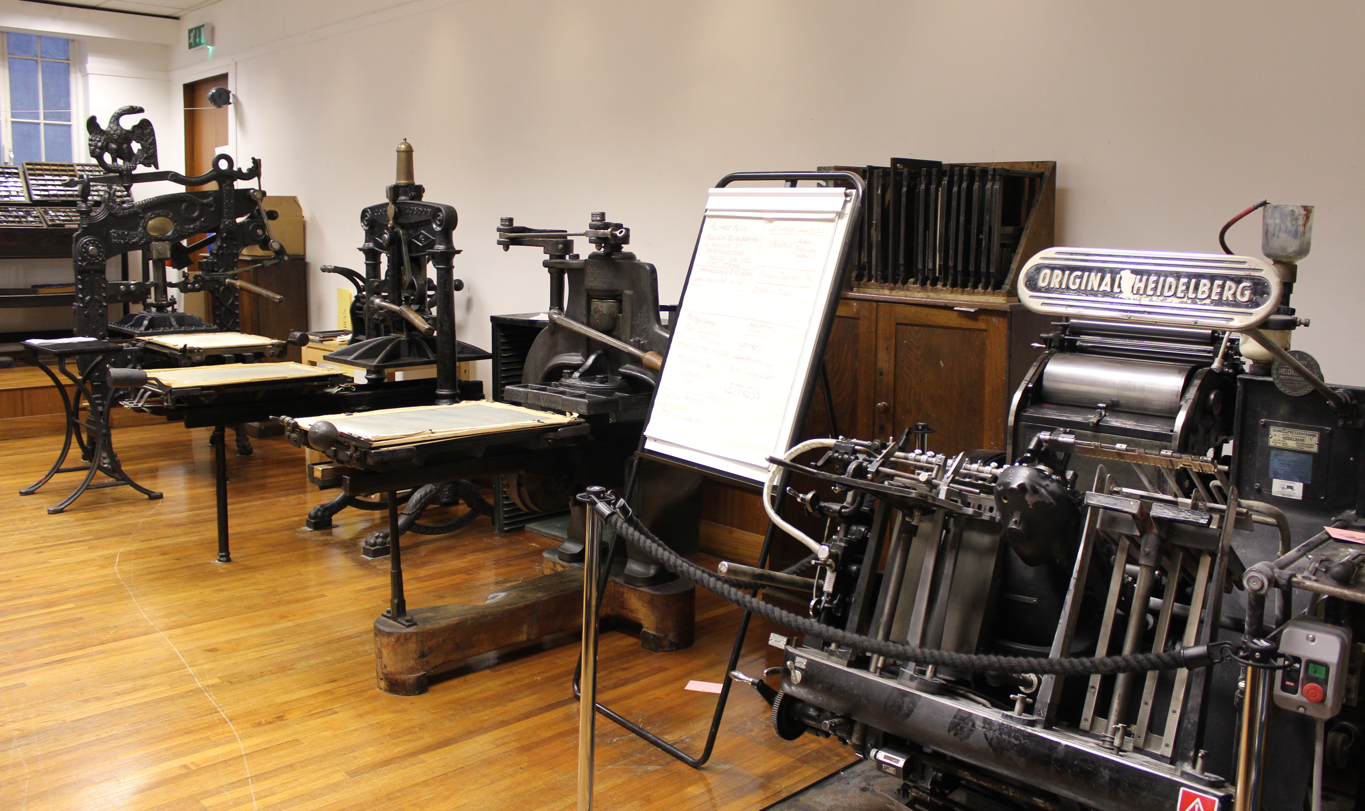 As the door to today’s print workshop opens, you are swiftly transported back to the days of the dominance of the printing presses via the strong smell of ink that permeates the space. This is a most atmospheric place – once the Foundation’s gymnasium – with its old presses lining the room. The oldest is a Common Press machine, whose frame possibly dates back as far as the 16th century. A compositor’s case from Oxford University Press in the corner dates from 1668, the extensions attached to its legs a testament to the ever-growing height of the human race.