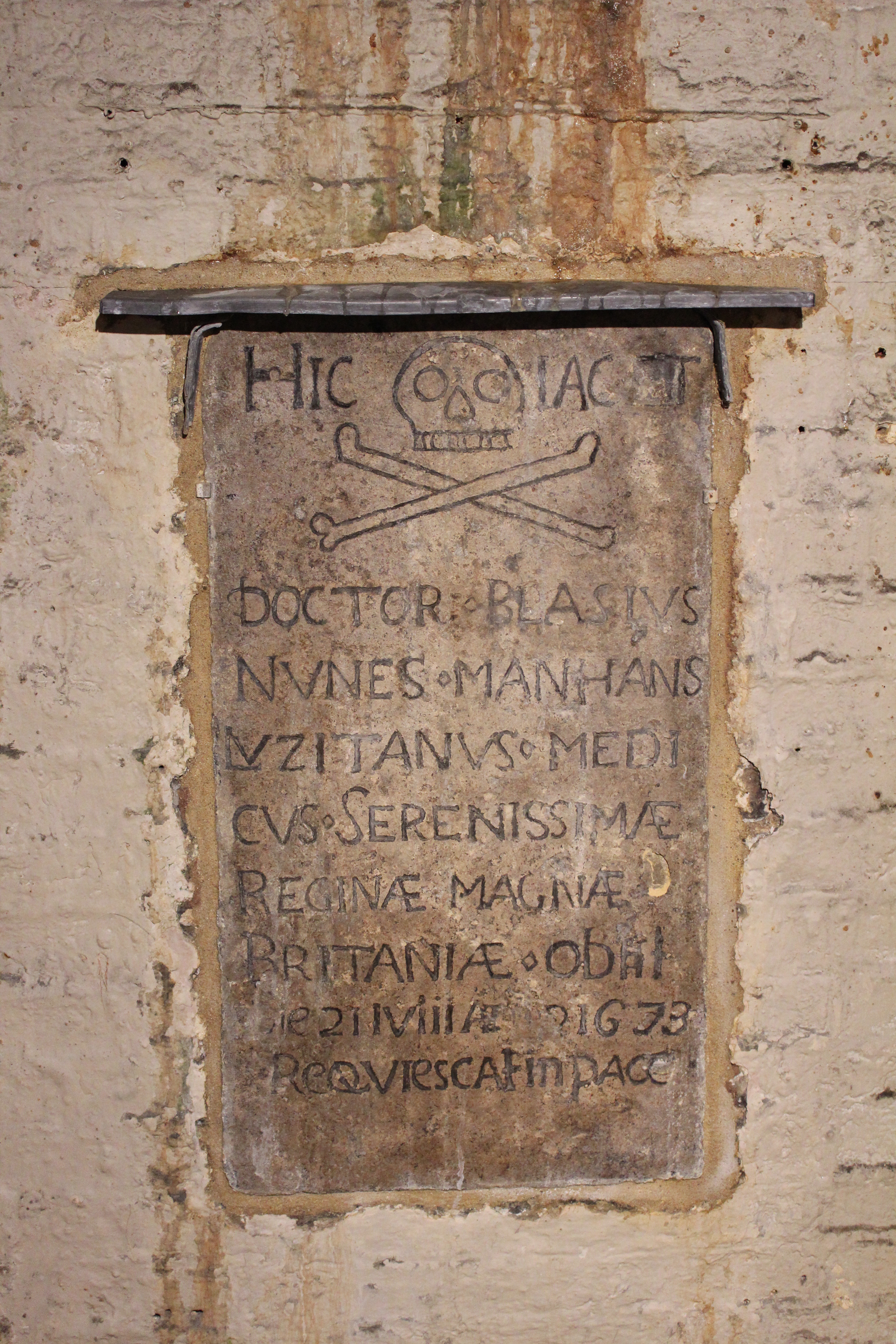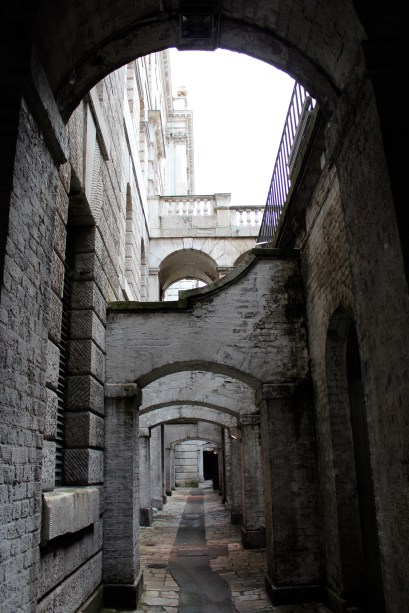 In short, a former incarnation of Somerset House used to be the Buckingham Palace of its day for the three queens who lived there. Charles I rather contentiously built a Roman Catholic chapel for his French queen Henrietta Maria here. This site also included a burial ground. When this version of Somerset House was demolished and replaced by the current building, which was built between 1776 and 1802, some of these gravestones were kept and relocated into the walls of what is now known as the Deadhouse. These walls actually serve to support the quadrangle due to the sloping nature of the site.